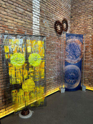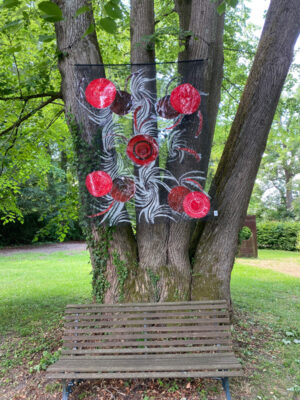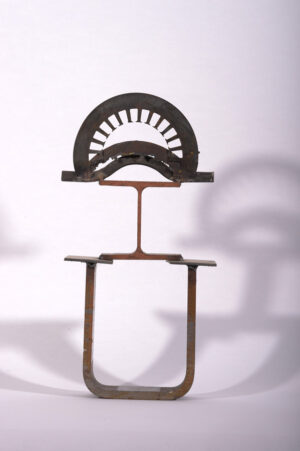 Thema: Die Skulptur besteht aus den Elementen, die für den Aufbau des Elektro Motors wichtig sind. Die Wicklungen der Bleche wird von Frauen vorgenommen, da sie die Sensibilität für das Material mit feinfühligen Hände haben.