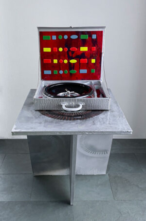 Die Skulptur besteht aus den Elementen, die für den Aufbau des Elektro Motors Elementar sind. Die Wicklungen der Bleche wird von Frauen vorgenommen, da sie die Sensibilität für das Material mit feinfühligen Hände haben.