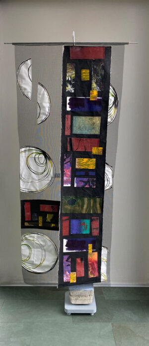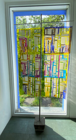 2020, Stahl, Ziegelsteine, Acryl, Motorenteile, Stator Bleche mit —„Energie“ Wellen bedruckt auf Acryl Platte,